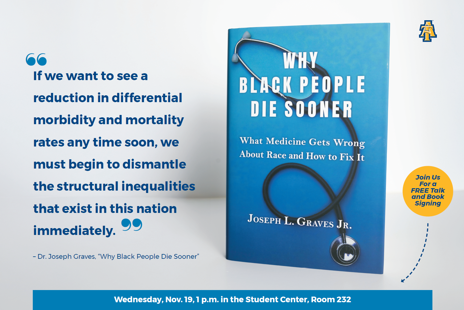 North Carolina Agricultural and Technical State University will host a talk and book signing by MacKenzie Scott Endowed Professor of Biology Joseph L. Graves Jr., Ph.D., on Wednesday, Nov. 19.