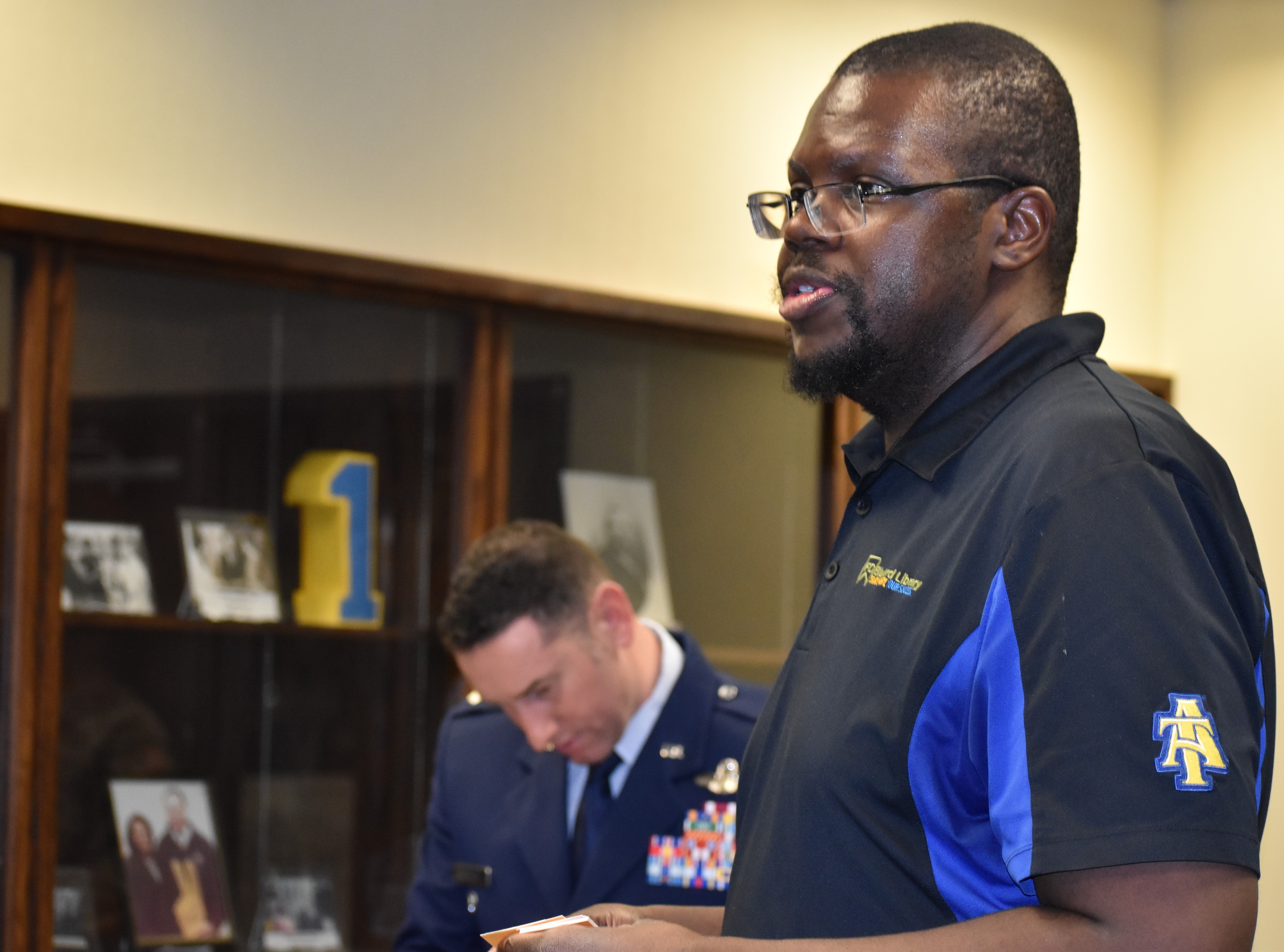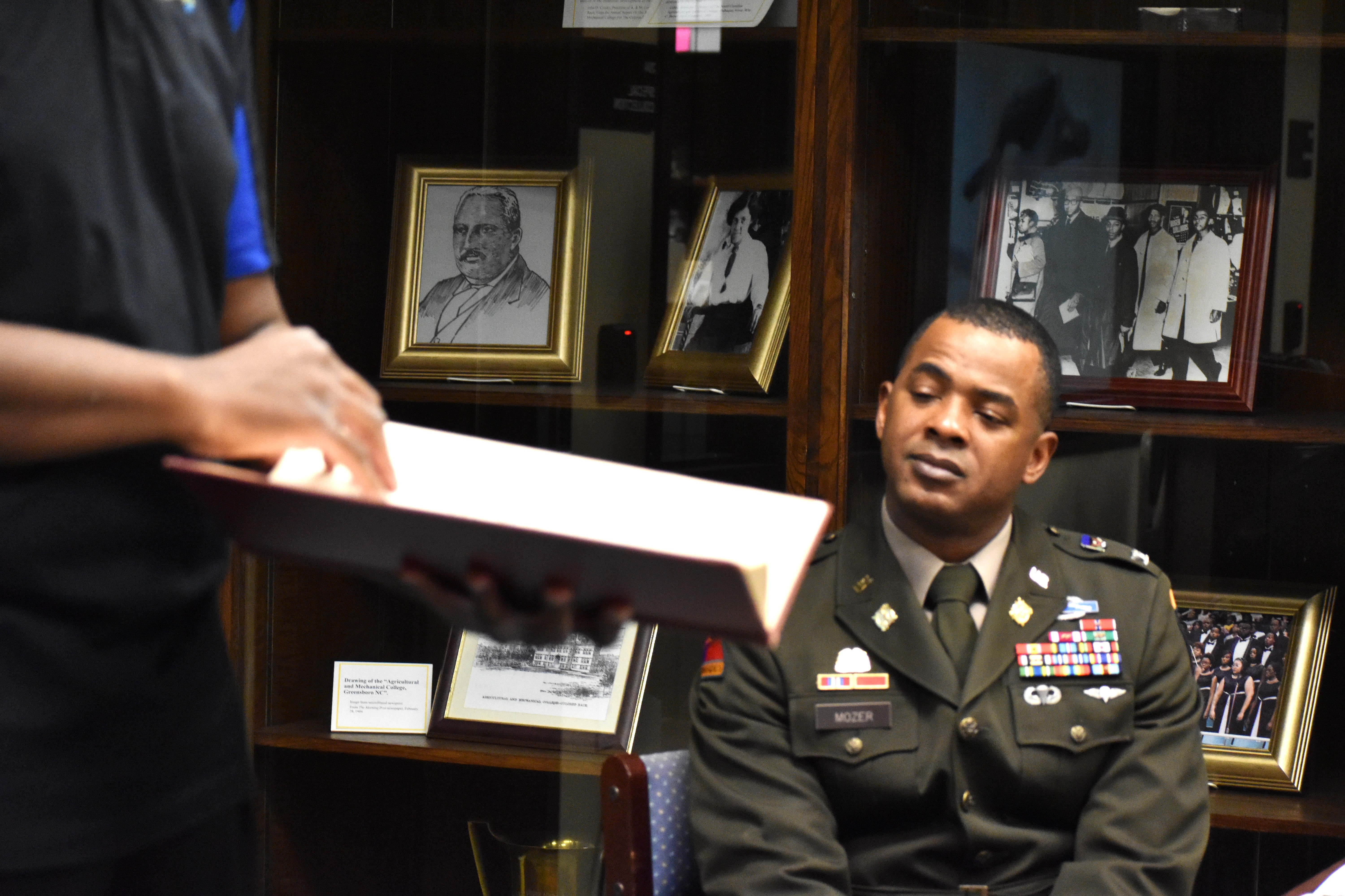 N.C. A&T Professor Earnest Hooker in the Department of History and Political Science and Army ROTC Cadet Avery Collins hosted War College assistant professor, Col. Trent Hunton, and War College students Col. Seana Jardin, Col. Donyeill Mozer and Lt. Col. Matthew Taylor.